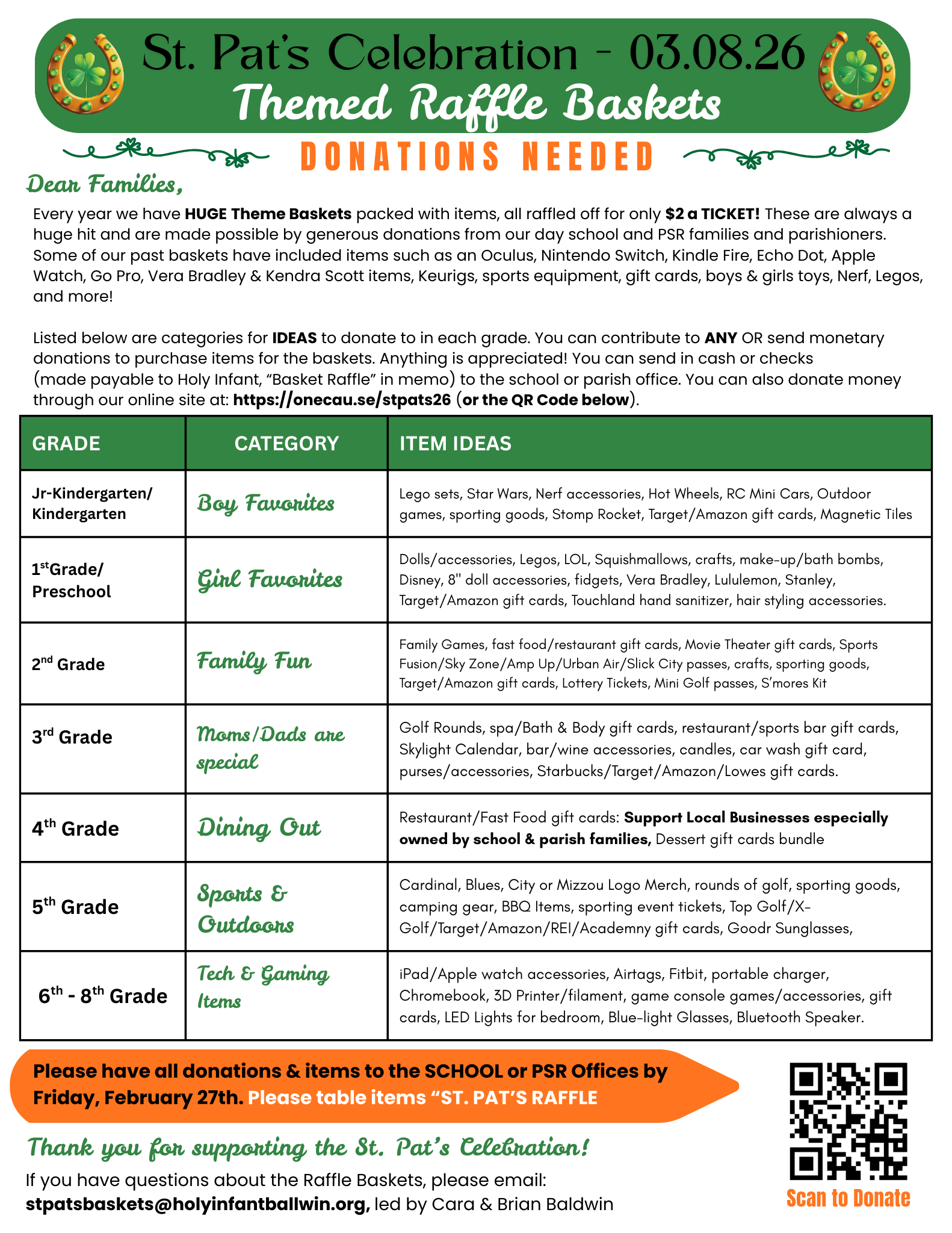 We appreciate all your help to make this event a huge success! We will be collecting raffle basket donations until Friday, February 27th...you can turn them into the school office, PSR office, or parish office, just label them for the St. Pats Raffle Baskets. You can also make monetary donations directly on the St. Pats site!